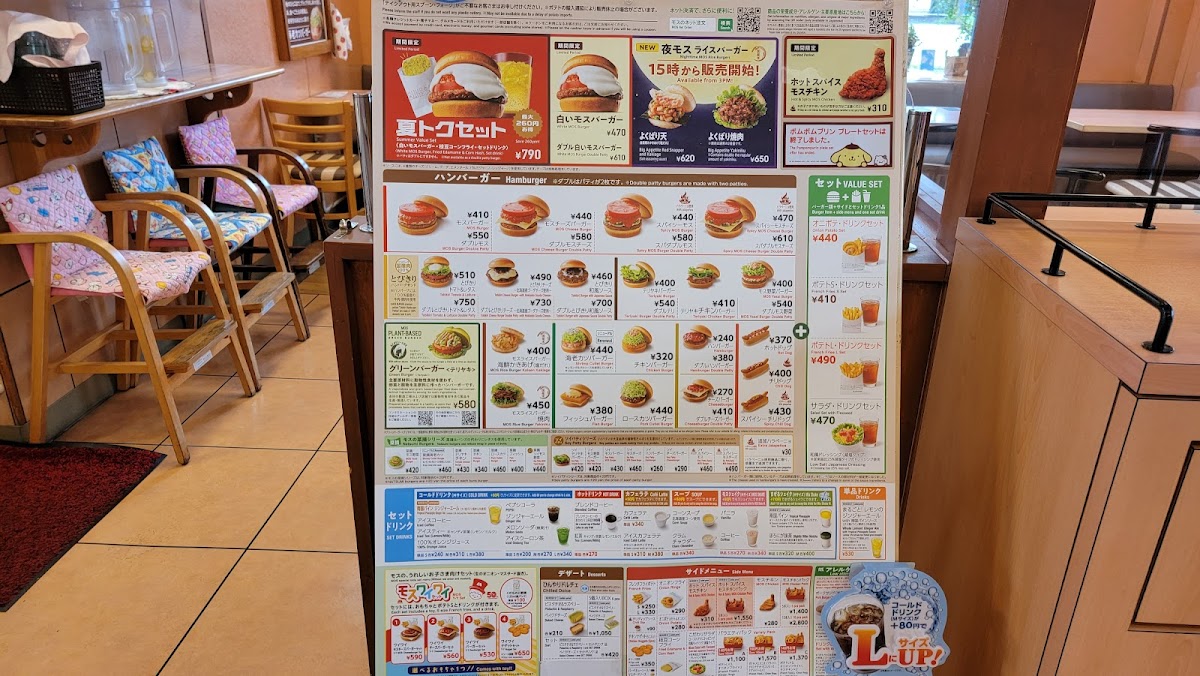 For those who enjoy a lighter option, the 菜摘 フィッシュバーガー (Nasumi Fish Burger) is a great pick, with a fresh fish fillet served on a light, healthy bun. The モスチーズバーガー (Mos Cheese Burger) is a crowd favorite, perfect for cheese lovers who crave a creamy and indulgent burger experience. If you’re in the mood for something different, the エビマヨソースの海老カツバーガー (Ebi Mayo Sauce Shrimp Cutlet Burger) serves up a delicious seafood twist with crispy shrimp and creamy mayo sauce.